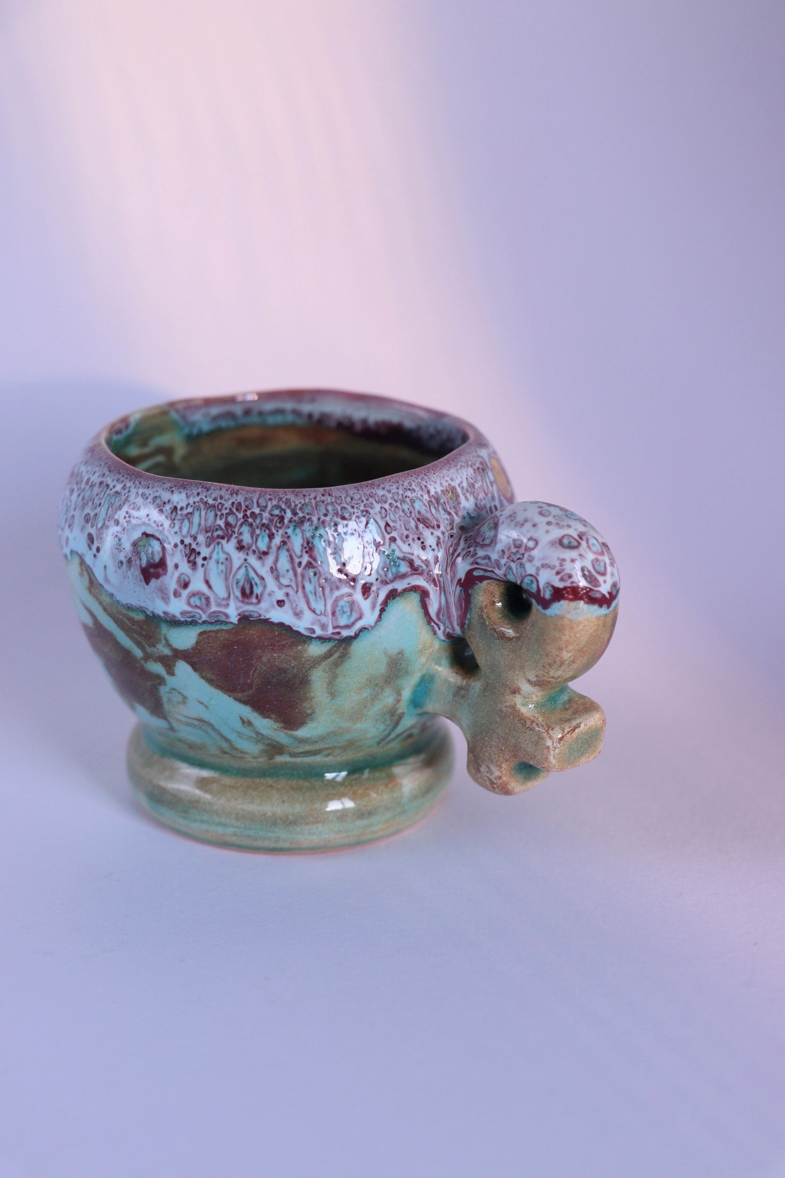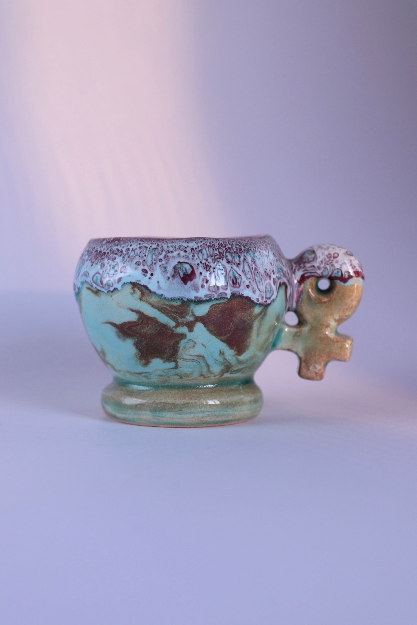 Realizzata con tecniche artigianali, ogni tazzina è unica, con sfumature, forme e dettagli che la rendono un piccolo pezzo d’arte contemporanea. Perfetta come oggetto da collezione, come tazza per rituali personali o come dono significativo a chi apprezza design, simbolismo e artigianato consapevole.